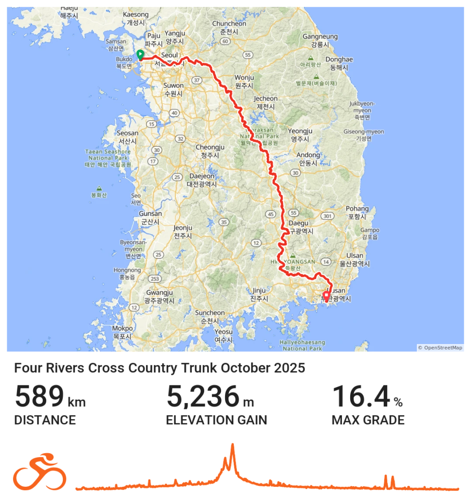 When I was cycling in South Korea in October 2025, I found it very useful to have good route data for my cycling computer. It was especially useful for navigating between the Four Rivers Cross Country bicycle path and railway stations or hotels.
