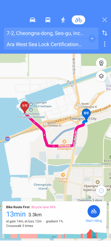 Kakao’s suggested route from Cheongna International City railway station to the start of the Four Rivers Cross Country bicycle path. Note the bicycle land percentage, 96% in this case