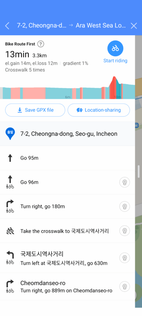 It would have been possible to use other approaches to get GPX files for the route from a source like RideWithGPS (example 1, example 2, example 3) or from this post on Naver, but I wanted to generate a GPX file independently.